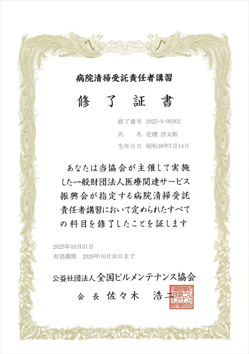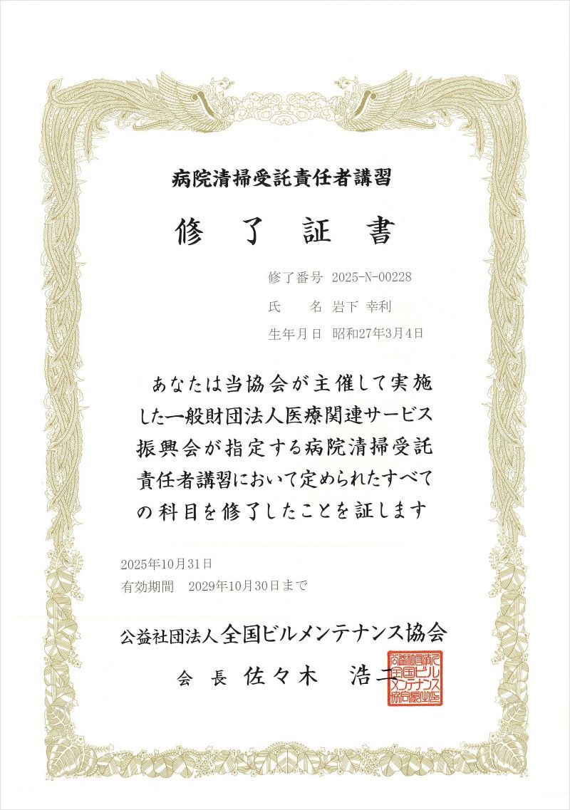 | 主な取引先 | 防衛装備庁、放送大学、相模原市役所、JAXA相模原キャンパス、相模原警察署、麻布警察署、空港警察署、相模原市内総合病院、広域ダム管理事務所、神奈川県立高校2件、マンション共用部清掃(120棟)、県立湘南公園清掃管理、大手カラオケBOX(60件) 他多数 |